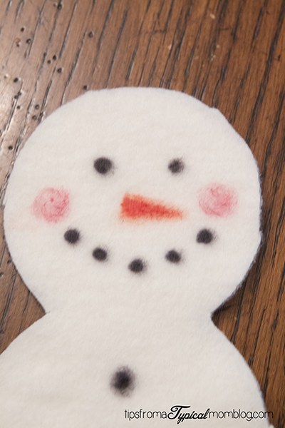 Using a black sharpie, draw the eyes, mouth and buttons. With a red marker lightly make rosy cheeks and with an orange marker make a long sideways triangle for a carrot nose.